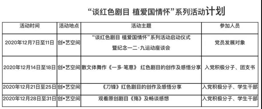 为弘扬爱国主义精神,培养学生的爱国主义情怀,12月7日,舞蹈学院在创·艺工作站顺利开展“谈红色剧目·植爱国情怀”系列活动启动仪式暨纪念一二·九运动座谈会。我院团总支老师、党员发展对象、入党积极分子参加了本次座谈活动。