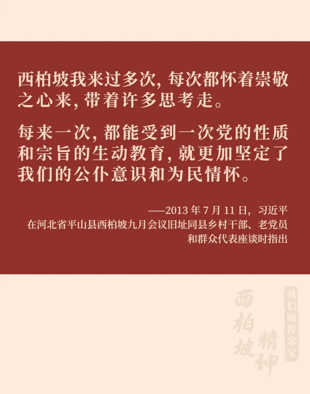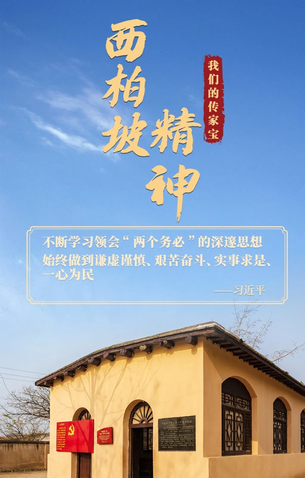 2013年7月,习近平总书记来到革命圣地西柏坡,瞻仰旧址。总书记号召全党同志,要不断学习领会“两个务必”的深邃思想,始终做到谦虚谨慎、艰苦奋斗、实事求是、一心为民,继续把人民对我们党的“考试”、把我们党正在经受和将要经受各种考验的“考试”考好,使我们的党永远不变质、我们的红色江山永远不变色。