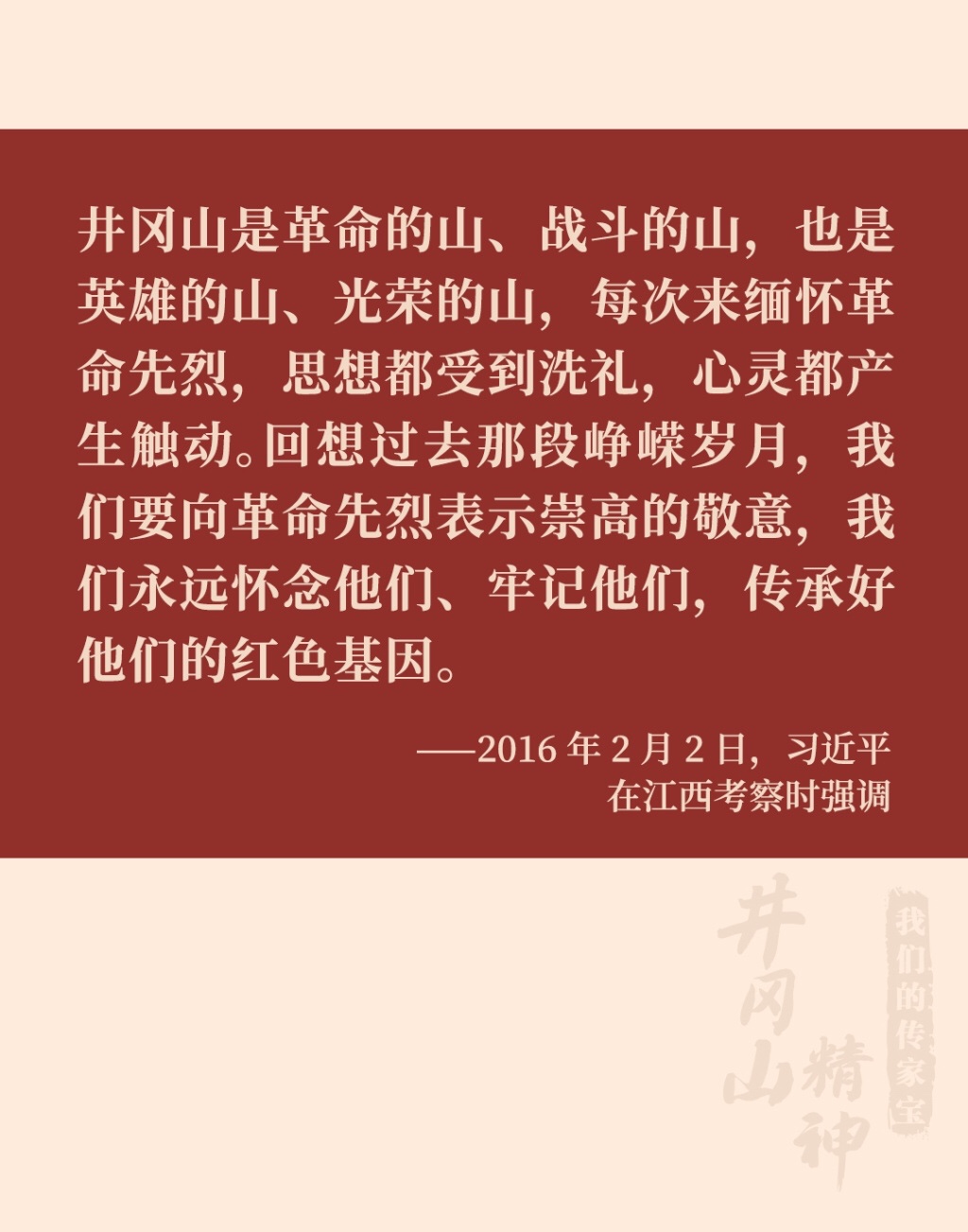 2016年2月,习近平总书记在江西考察时说:“今天,我们要结合新的时代条件,坚持坚定执着追理想、实事求是闯新路、艰苦奋斗攻难关、依靠群众求胜利,让井冈山精神放射出新的时代光芒。”
