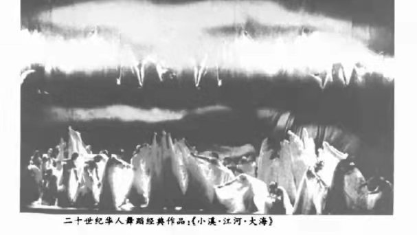 《小溪·江河·大海》通过女子群舞的动作连接表演,聚合有序又错落有致的舞蹈造型和队形以及“圆场步”等基本动作的组合,体现了中国古典舞的流转之美以及整体构图方面的丰富形象。从泉水之滴到大海之涌这一象征过程,不仅逼真地展现了大自然的魅力而且也对比了改革开放前后社会的变化。