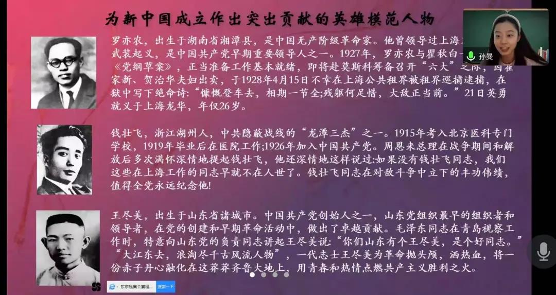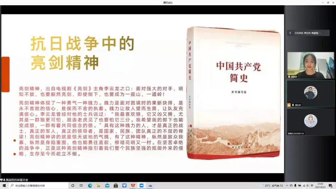 线上会议中,大家共同学习了《中国共产党简史》中“伟大建党精神”“人民为什么选择共产党”“共青团员在新时代的基本任务”等内容,并结合自身读书学习体会,进行了线上心得分享。历史赋予使命,时代要求担当。用社会主义核心价值体系教育青年,在建设中国特色社会主义的伟大实践中,造就有理想、有道德、有文化、有纪律的接班人。