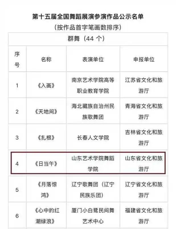 近日,文化和旅游部正式公示了第十五届全国舞蹈展演参演作品名单。山东艺术学院舞蹈学院原创舞蹈作品《日当午》成功入选,学院学子将代表学校登上国家级展演平台。