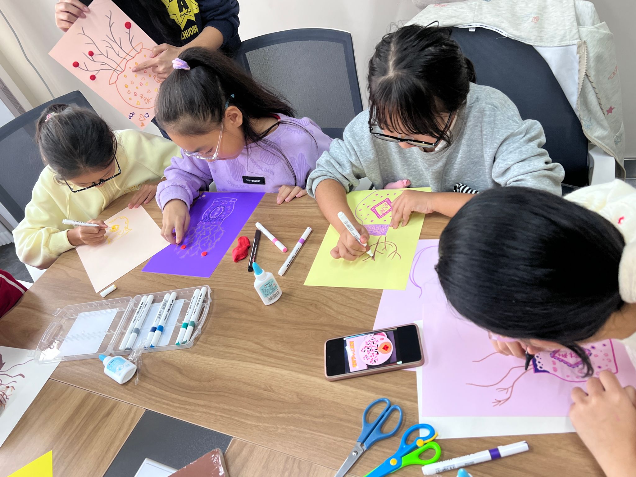 在手工环节中,孩子们充分发挥创意,兴致勃勃地画花瓶、捏粘土花,把传统手工玩出了童趣新花样。他们通过亲手制作这些手工作品,不仅锻炼了动手能力,更让传统文化的种子在心中生根发芽。