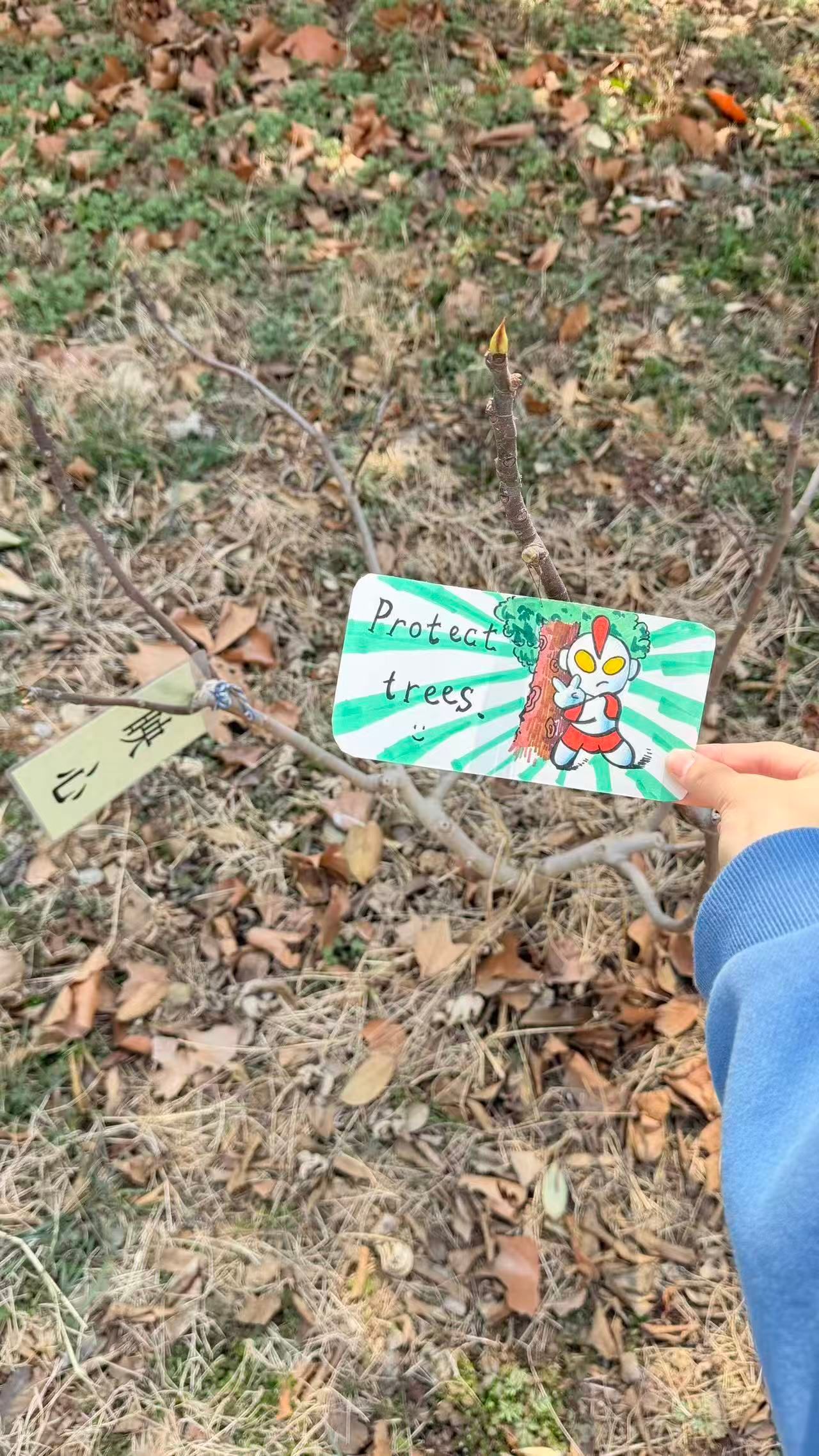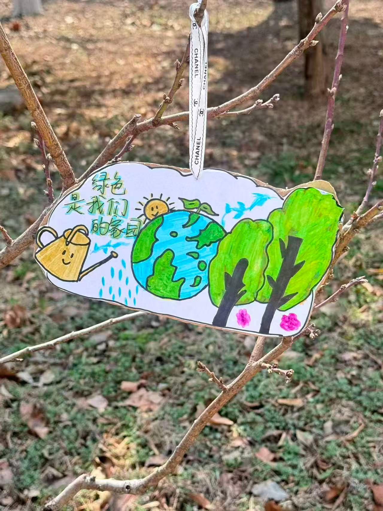 活动现场,同学们热情高涨,分工协作。从挥锹挖坑、扶正树苗,到培土夯实、提水浇灌,每一个步骤都一丝不苟。汗水挥洒间,一株株新苗稳稳扎根沃土,迎风挺立,为春日的校园增添了一片生机勃勃的新绿。植树完成后,同学们充分发挥艺术才华,精心设计并绘制了创意树牌。树牌内容既有“爱护地球”的质朴心声,也有中英文的环保标语,更巧妙融入了飘逸的舞蹈线条与形体元素,将生命律动与自然之美凝于方寸之间。这些独特的树牌悬挂于枝头,既是温馨的环保提示,也是校园里一道生动的美育风景线。
