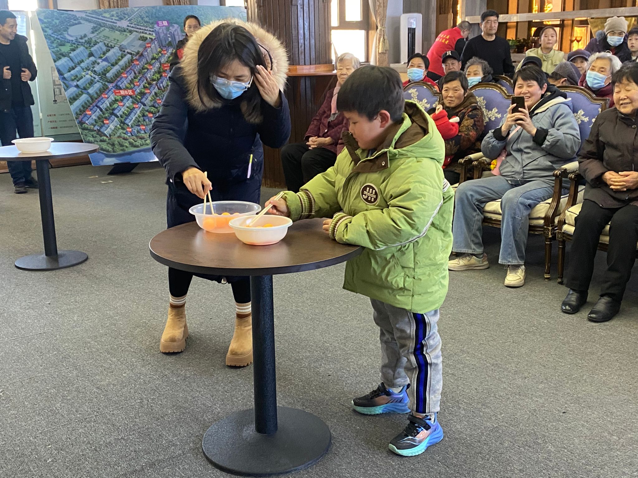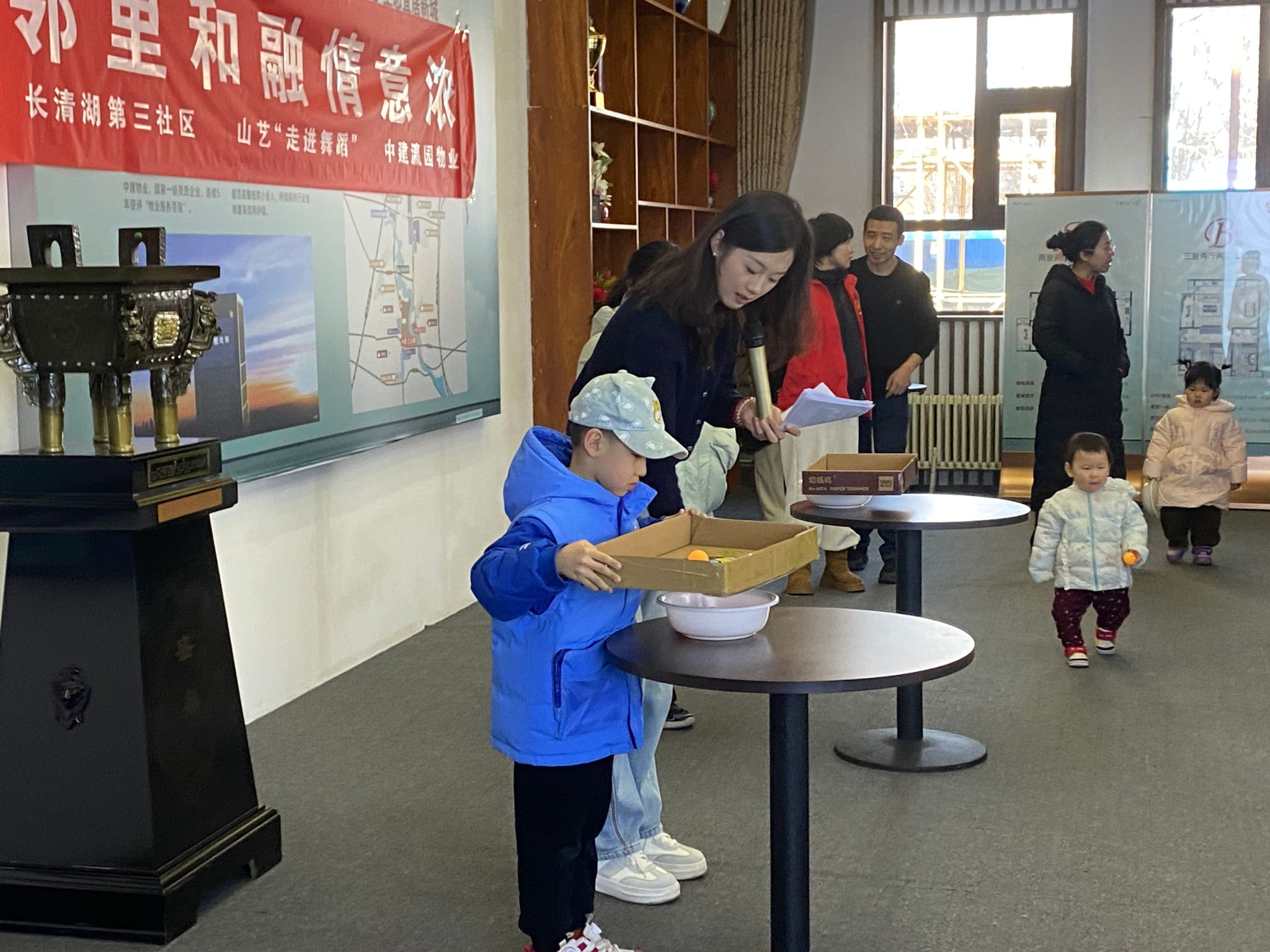 随后,志愿者们和社区联合精心准备了“猜灯谜”、“夹元宵”、“滚元宵”等趣味小游戏,居民们踊跃参与,现场欢声笑语不断。猜灯谜环节,志愿者们将传统文化知识与趣味谜语相结合,寓教于乐,让居民们在游戏中感受传统文化的魅力;夹元宵和滚元宵游戏则考验了大家的动手能力,居民们玩得不亦乐乎,现场气氛热烈。